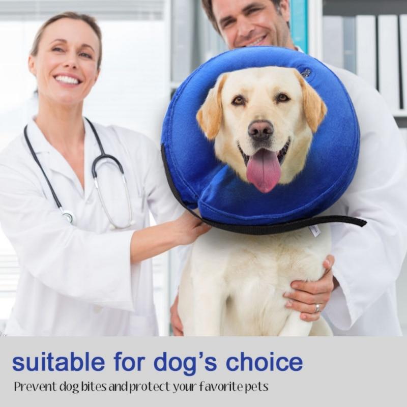 Inflatable Dog Protective Collar is a soft, secure, and inflated collar designed to prevent your pet from scratching or biting the injured area. Their peripheral vision is not interfering; they can usually eat, drink, and sleep. And it would not mark or scrape furniture. Perfect for dogs and cats recovering from surgery, and itโs washable.